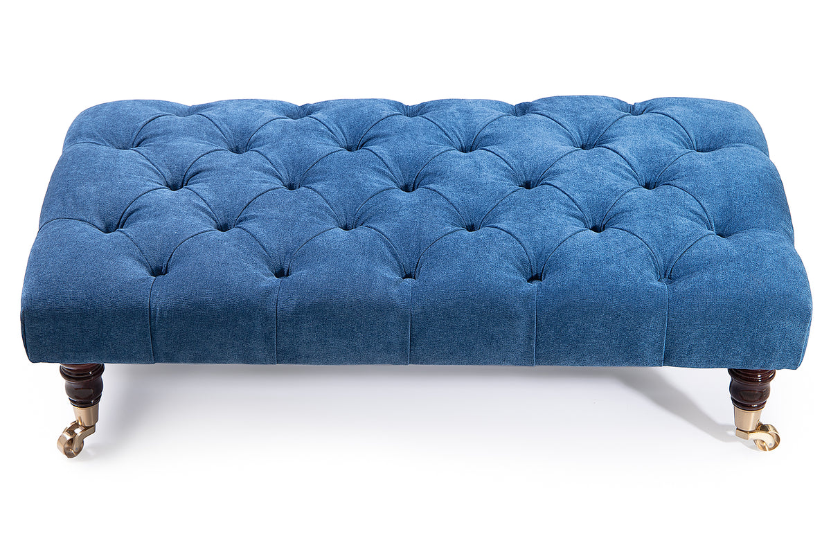 The Bleu footstool in the image is upholstered in our Royal Blue Soft Velvet fabric with our optional “short” mahogany gloss brass castor legs.