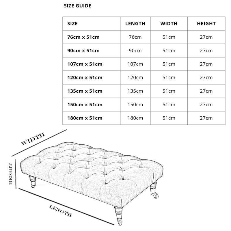 The Bleu footstool/coffee table incorporates the timeless deep buttoned chesterfield design. This hand made piece of furniture is ideal to use as a footstool or coffee table and would also suit most homes as it can be upholstered in over 60 various colours and fabrics.