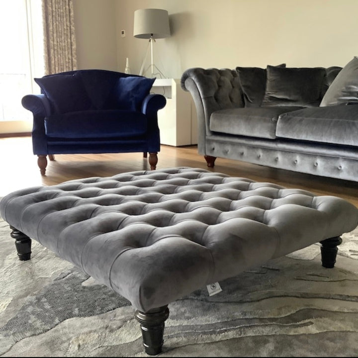 The Chesterfield footstool in the main image is upholstered in our Argent Silver Velour with our Turned Wenge Legs. The footstool in the image above the product description is upholstered in Graphite Grey Velour.