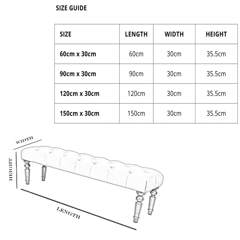 Full of timeless grace, the Chloe bench is exquisitely upholstered with its deep buttoned chesterfield design.