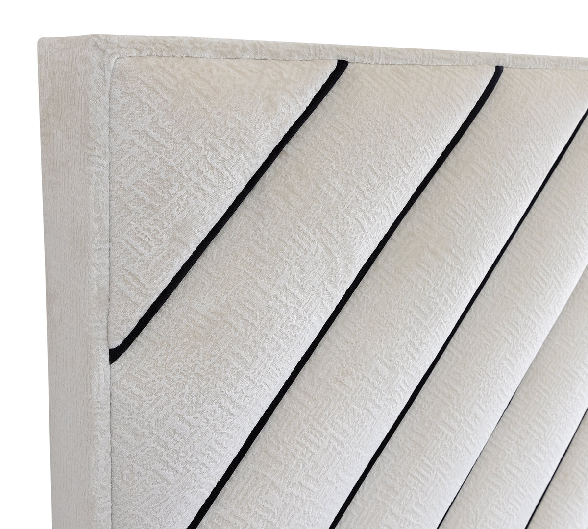The on-trend headboard features individual fluted panels which are luxuriously padded. Separating each diagonal panel, detailed contrasting piping has been used to enhance the aesthetics of this awe inspiring headboard.
