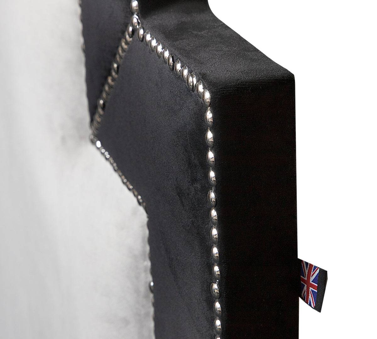 The Gothic wall-mounted headboard features square cut corners with a luxuriously padded centre. A twin row elegant studded border is placed intricately around the outer edge of the headboard as well as an inner studded border running parallel and in line with the outer border.
