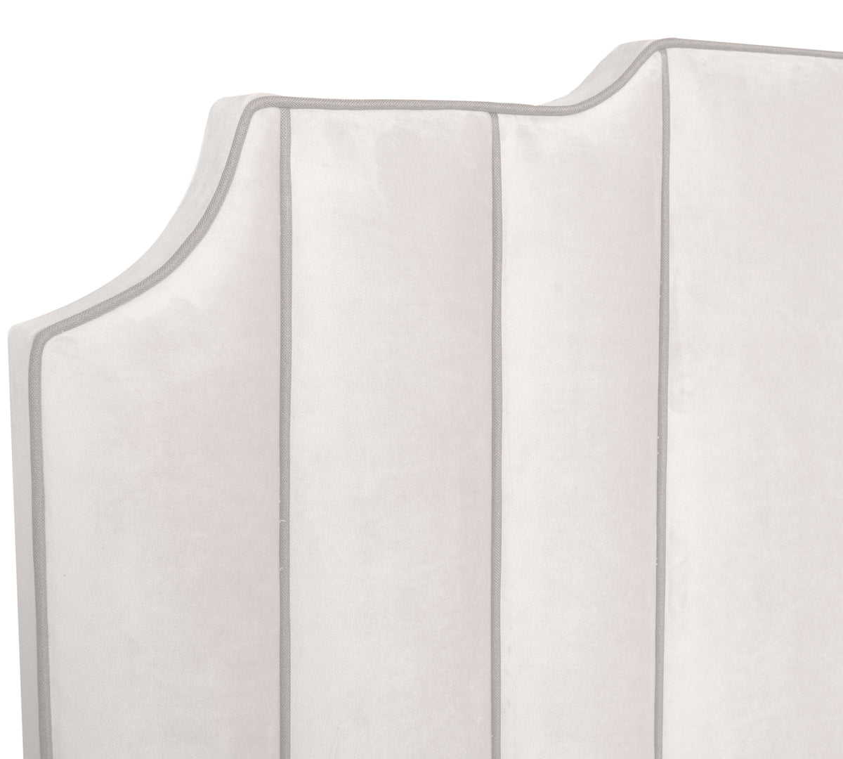 The Lalique headboard in the image is upholstered in our Ivory Velour with the contrasting piping trim in Silver Grey Velvet.