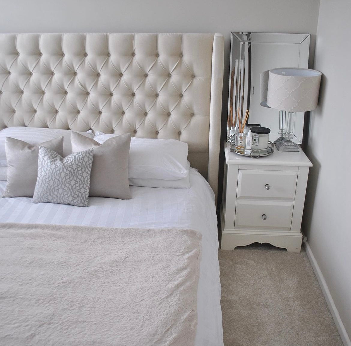The Winged chesterfield headboard in the image is upholstered in our Argent Silver Velour. The Winged headboard in the lifestyle image is upholstered in our Ivory soft velvet.